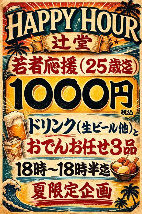 できれば月替わりでご提供させていただきたいと思います。今回は25歳以下の方限定でドリンク(ビール、ハイビール、レモンサワー他)とおでんお任せ3品を1000円(税込み)18時~18時半迄 ご来店心よりお待ちしております